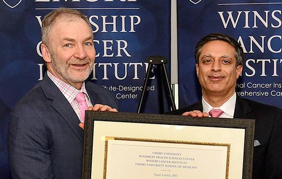 Winship Executive Director Walter J. Curran, Jr., with Sagar Lonial (right), Winship chief medical officer. Lonial received the Anne and Bernard Gray Family Chair in Cancer.