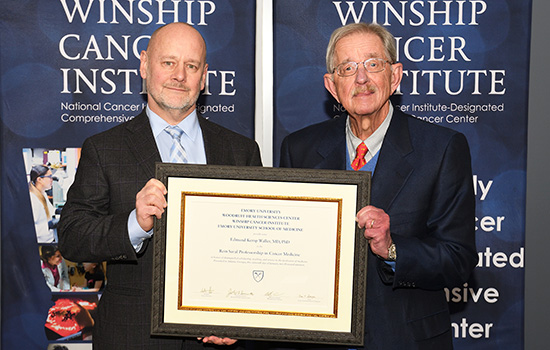 Edmund K. Waller (left), director of Winship's Bone Marrow and Stem Cell Transplant Program, with Rein Saral, Winship Professor Emeritus, receives the Rein Saral, MD Professorship in Cancer Medicine.
