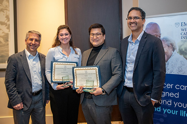 Erin Grundy, PhD, with mentor Gregory Lesinski, PhD, MPH (left), and Naoto Tokuyama, PhD, with mentor Anant Madabhushi, PhD (right), are the 2025 Winship Postdoctoral Scholar Award recipients.