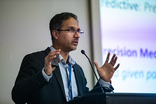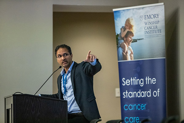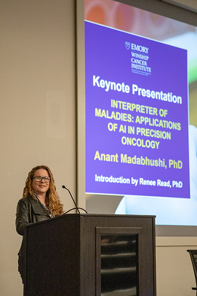 The keynote address was delivered by Winship researcher Anant Madabhushi, PhD, professor in the Wallace H. Coulter Department of Biomedical Engineering at Emory and Georgia Tech and executive director of the Emory Empathetic AI for Health Institute. His presentation, “Interpreter of Maladies: Applications of AI in Precision Oncology,” set the tone for the day’s focus on harnessing technology to improve the lives of people with cancer.
