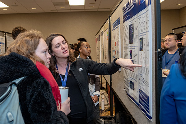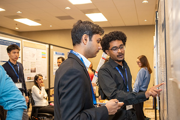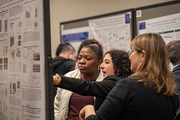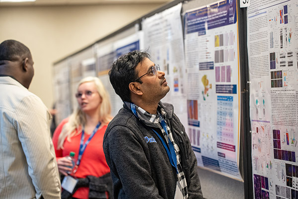 Researchers and trainees fill the aisles of the poster session at the 2025 Winship Scientific Symposium.