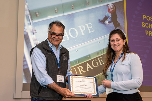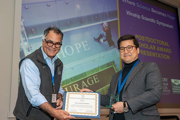 The symposium also celebrated the achievement of Winship’s emerging scientists. Naoto Tokuyama, PhD (Madabhushi lab), and Erin Grundy, PhD (Lesinski lab), were named recipients of a 2025 Winship Postdoctoral Scholar Award. The award honors outstanding postdoctoral fellows and provides an annual stipend and funding for their continued professional development.