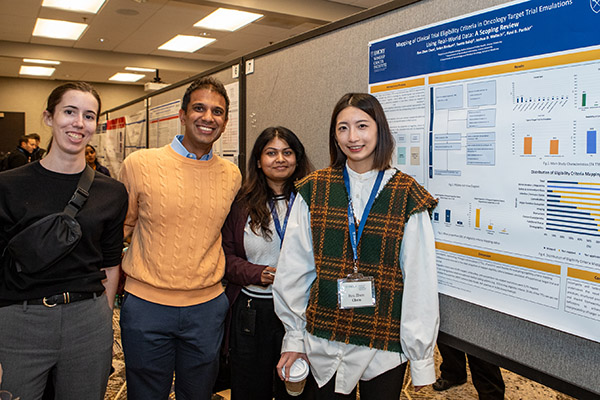 Throughout the day, 12 podium presentations — representing faculty and trainees from 10 different Emory departments — showcased wide-ranging applications of AI, large language models and multi-omics analysis in oncology. Two of the talks featured collaborative pilot projects from Winship and American Cancer Society researchers, demonstrating the impact of a recent inter-institutional data-sharing initiative. From refining cancer risk prediction and treatment approaches to optimizing clinical trials, the presentations underscored how next-generation computational tools are driving progress across cancer types and research disciplines.