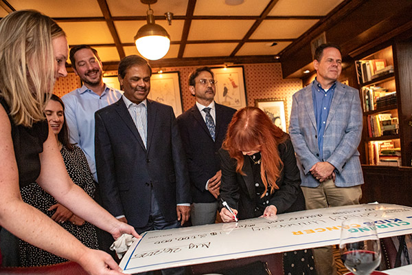 During a recent ceremony, the Owens presented the gift to Dasgupta alongside colleagues including Suresh S. Ramalingam, MD, FACP, FASCO, Winship’s executive director, and Douglas K. Graham, MD, PhD, chief of the Aflac Cancer and Blood Disorders Center at Children’s Healthcare of Atlanta.